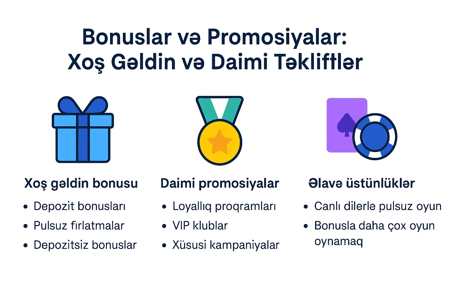 Bonuslar və promosiyalar oyun təcrübənizi əhəmiyyətli dərəcədə yaxşılaşdıra və pul qazancınızı artıra bilər. Kazinolarda bonuslar xoş gəldin bonusu və davam edən promosiyalar olmaqla iki hissəyə bölünür.