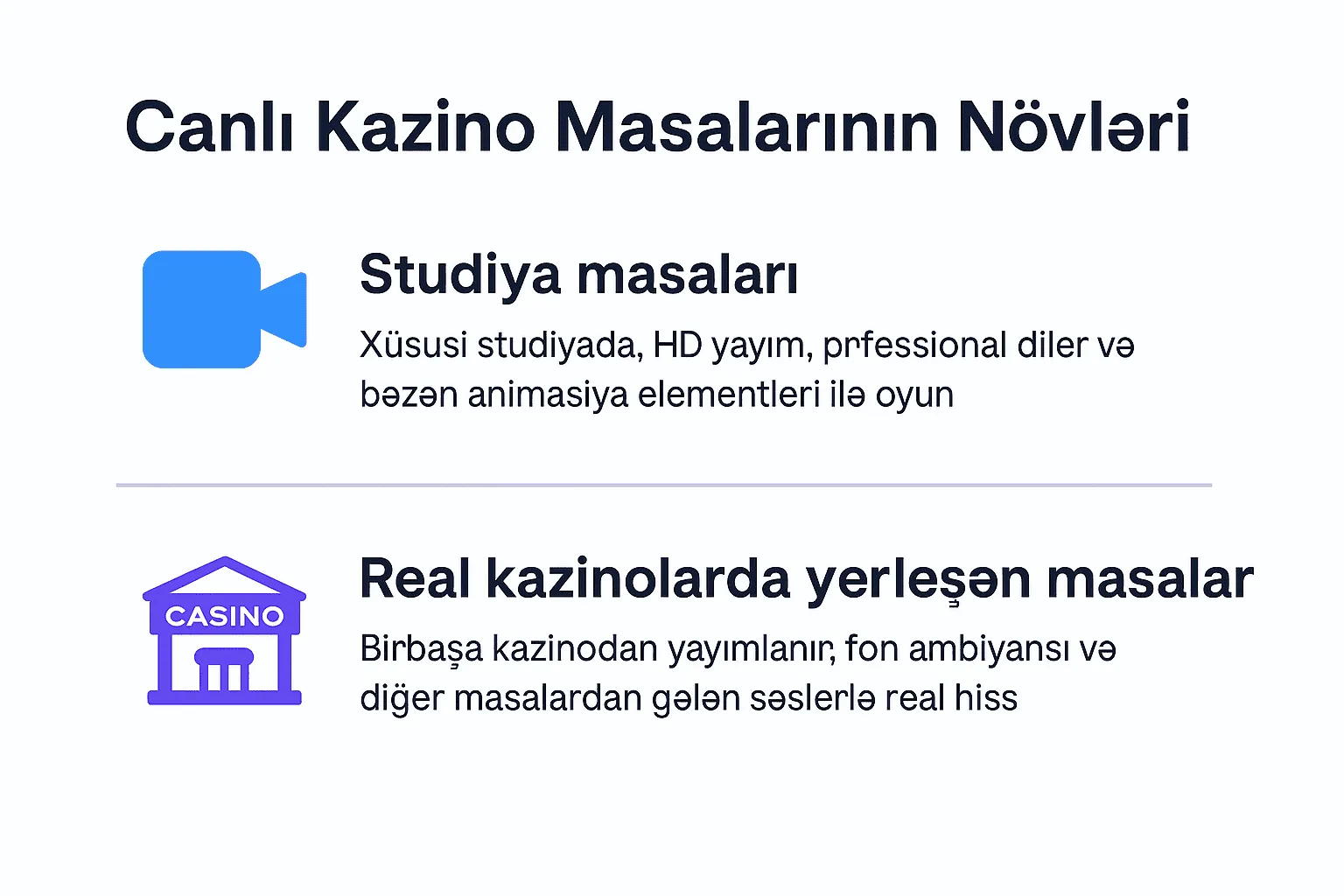 Azərbaycanda canlı kazino orijinal oyun təcrübəsi təklif etdikləri üçün onlayn qumarbazlar arasında böyük populyarlıq qazanmışdır. Bu platformalar təcrübəli insan dilerləri və qabaqcıl yayım texnologiyası tərəfindən həyata keçirilən müxtəlif klassik və innovativ oyunlara malikdir. Canlı kazinolarda tapa biləcəyiniz ən populyar oyunlardan bəziləri aşağıdakılardır.