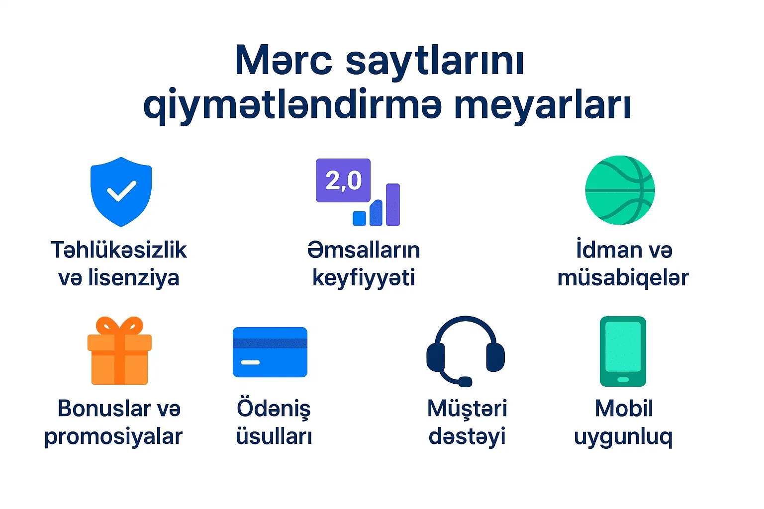 Azərbaycanda merc sayti və ya kazino saytlari seçiminə gəlincə, bir neçə vacib amili nəzərə almaq lazımdır. Bu amillər mərclərinizi edərkən təhlükəsiz və xoş təcrübə əldə etməyinizə kömək edir. Bu bölmədə biz mərc saytlarını istifadəçi təhlükəsizliyi, əmsalların keyfiyyəti, mövcud idman və müsabiqələr, bonuslar və promosiyalar, ödəniş üsulları, müştəri dəstəyi və mobil uyğunluq kimi əsas meyarlara əsasən necə qiymətləndirdiyimizi müzakirə edəcəyik. Bu xüsusiyyətlərə diqqət yetirməklə, mərc ehtiyaclarınız üçün ən yaxşı merc oyunlari saytı seçməkdə sizə rəhbərlik etməyi hədəfləyirik.