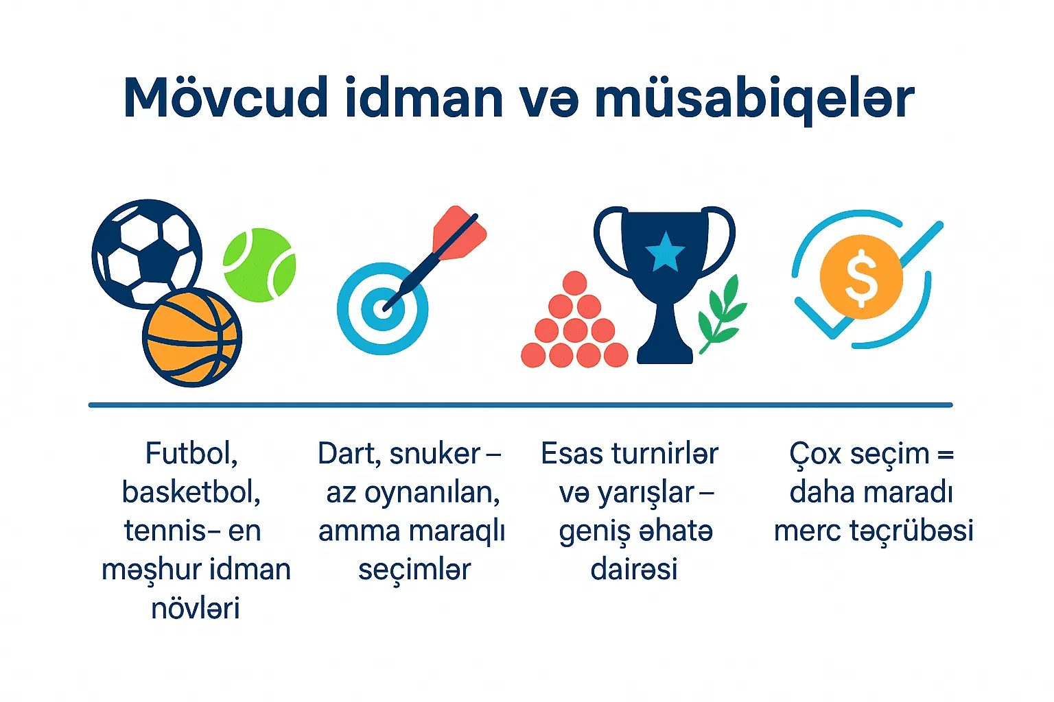 İdman müsabiqələrinə mərclər qədər müxtəlif yarışlarda mərc oynamağa imkan verir. Növbəti bölmələrdə biz futbol, basketbol, tennis, xokkey və boks kimi müxtəlif idman növləri üzrə mərcləri araşdıraraq, hər bir tədbir növü haqqında məlumat verəcəyik.
