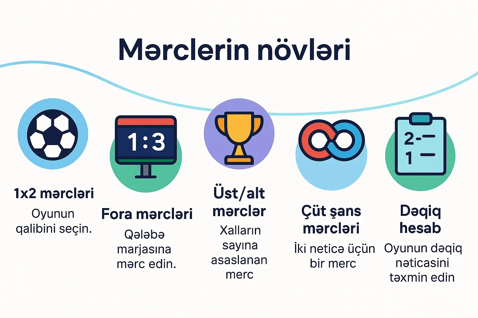 Azerbaycanda bukmeker saytları tərəfindən təklif olunan idman mərclərinə gəldikdə, edə biləcəyiniz bir neçə növ mərc var. Əsas ümumi mərclər isə bunlardır.