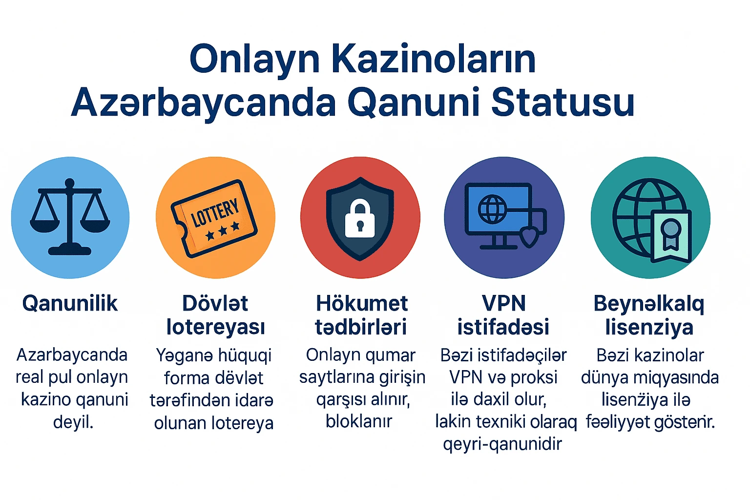 Azərbaycanda real pul onlayn kazino qanuni deyil. Onlayn qumar oyunlarını qadağan edən xüsusi qanun olmasa da, onu tənzimləyən qanunvericilik bazası da yoxdur. İlk növbədə qeyd etmək lazımdır ki, Azərbaycanda istənilən formada qumar oyunları ümumiyyətlə qanunsuz hesab olunur. Ölkədə qumar oyunlarının yeganə hüquqi forması dövlət tərəfindən idarə olunan dövlət lotereyasıdır. Onlayn qumar oyunları ilə bağlı xüsusi qanunvericiliyin olmamasına baxmayaraq, Azərbaycan hökuməti onlayn qumar saytlarına girişin qarşısını almaq üçün addımlar atıb. O vaxtdan bəri hökumət bir sıra onlayn qumar saytlarını bloklamaq üçün tədbirlər görüb. Azərbaycan vətəndaşlarının virtual şəxsi şəbəkə (VPN) və ya proksi serverdən istifadə edərək bəzi onlayn kazinolara daxil olması hələ də mümkün olsa da, bu, texniki cəhətdən qeyri-qanunidir. Lakin bununla belə ölkə ərazisində bir çox onlayn kazino fəaliyyət göstərir. Həmin kazinoların əldə etdiyi lisenziyalar onlara dünya miqyasında fəaliyyət göstərməyə imkan tanıyır. Yerli istifadəçilər xüsusən bundan istifadə edərək çox sayda real pulla ən yaxşı onlayn kazinolarda öz mərclərini yerləşdirirlər.