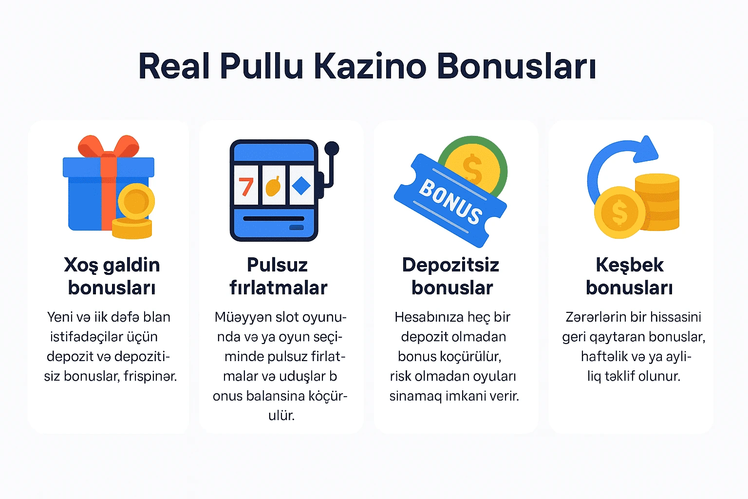 Real pullu kazinolarda bonuslar həm yeni başlayan, həm də daimi istifadəçilər tərəfindən çox sevilir. Kazino Azerbaycan saytlarında onlar pulsuz fırlatmalar, nağd pul və ya uyğun depozit bonusları kimi müxtəlif formalarda olur və oyunçulara oyun oynamaq üçün əlavə vəsait təmin edir. Aşağıda bu bonuslarında ən məşhur növlərinə toxunaraq onlar haqqında bəhs edəcəyik.