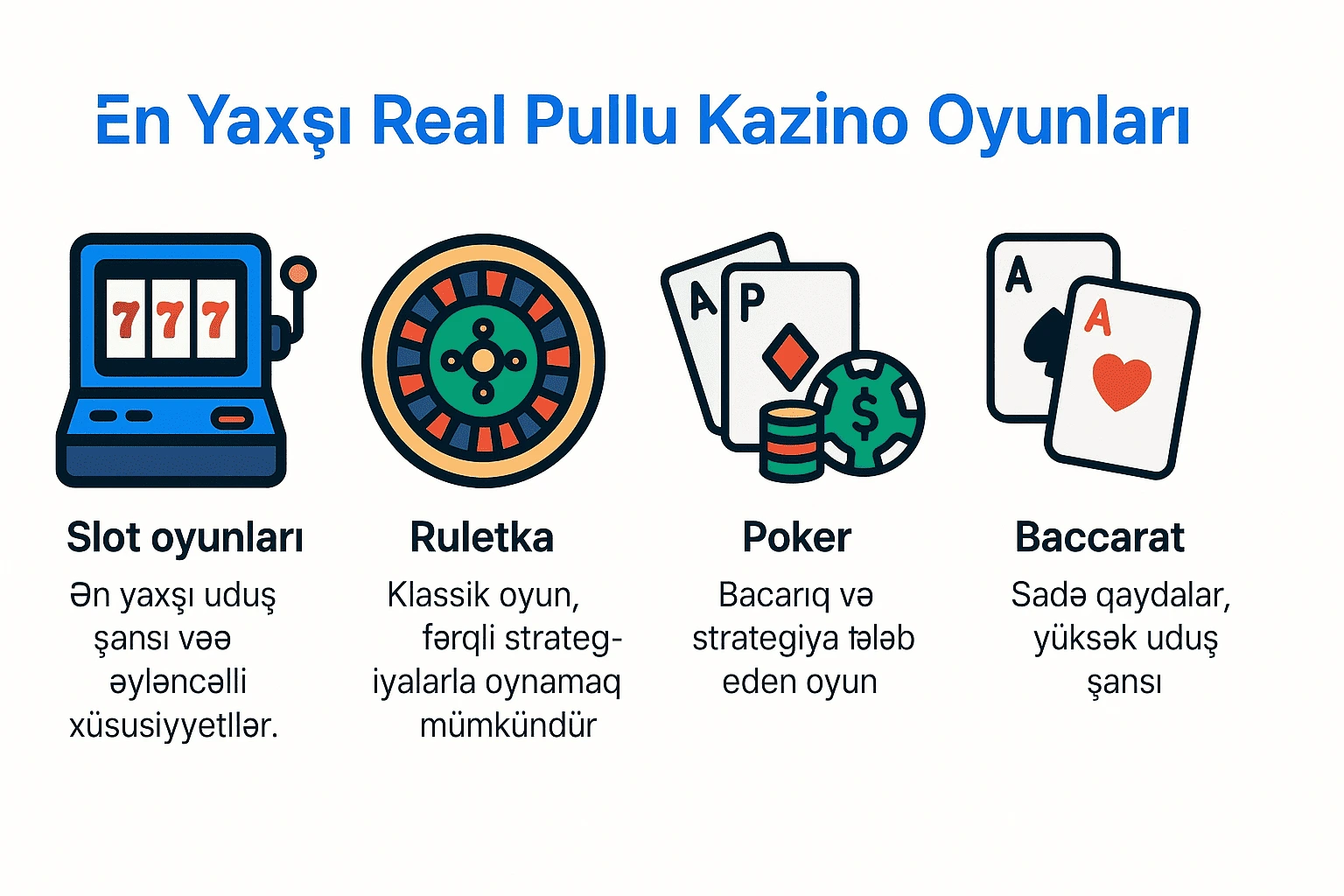 Əgər real pulla ən yaxşı onlayn kazino oynamaq istəyirsinizsə, hansı oyunların ən yaxşı uduş şansı və ən xoş təcrübə təklif etdiyini bilmək istərdiniz. Hər biri özünəməxsus xüsusiyyətləri və üstünlükləri olan bir çox müxtəlif növ kazino oyunları mövcuddur. Aşağıda onlayn oynaya biləcəyiniz ən yaxşı real pullu kazino oyunlarından bəziləri ilə tanış ola bilərsiniz.