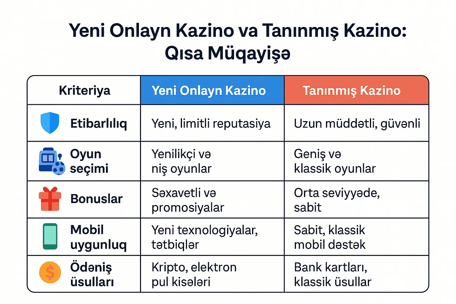 Yeni onlayn kazino ilə tanınmış kazino arasında seçim etmək üstünlüklərdən və prioritetlərdən asılıdır. Tanınmış kazinolar etibarlılıq hissi, geniş oyun seçimi və qurulmuş reputasiya təklif edir. Digər tərəfdən, yeni kazinolar masaya yenilik, maraqlı xüsusiyyətlər və səxavətli bonuslar gətirə bilir. Onlar həmçinin xüsusi nişlərə və ya bölmələrə də xidmət edə bilər. Bununla belə, onlar qurulmuş kazinoların sahib olduğu təcrübədən və geniş oyunçu rəyindən məhrum olmaq mövzusu da vardır. Nəhayət, oyunçular hansı növ kazinonun onların oyun ehtiyacları və gözləntiləri ilə daha yaxşı uyğunlaşacağına qərar verərkən lisenziya, oyun müxtəlifliyi, müştəri dəstəyi və bonuslar kimi amilləri nəzərə almalıdırlar.